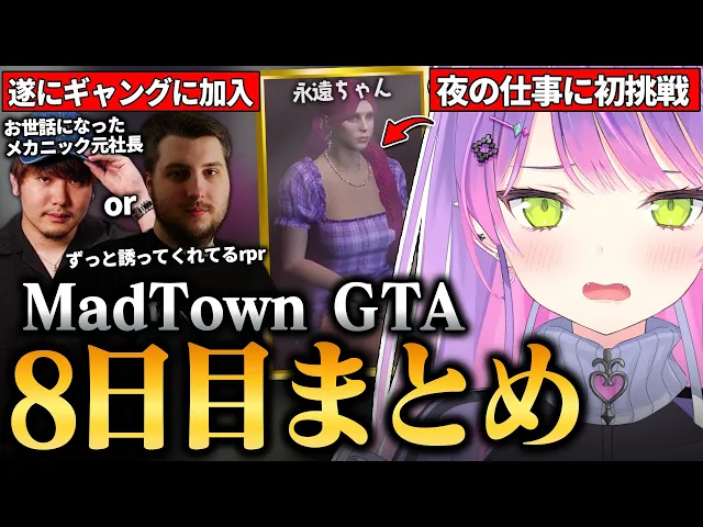 常闇トワのRP、MADTOWNでの8日目のハイライト。永遠ちゃんとしての接客や、ギャング選択、メカニックとの別れなど、感動と笑いが詰まったシーンを切り抜きで紹介。RPRや他ストリーマーとの交流も。