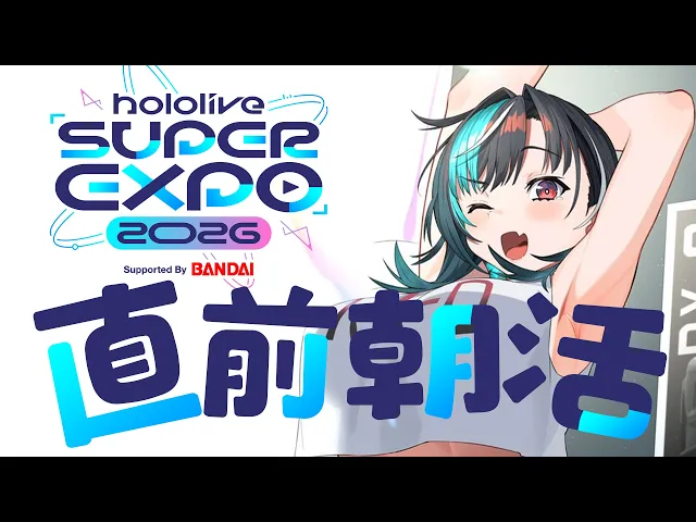EXPO直前の朝配信で輪堂千速が会場の展示情報や導線、撮影ポイントを案内。SUZUKIバイクに実際またがった話やホロライブ×ガンダムのバンシィコラボ発表で盛り上がり、好きなことを発信し続けた成果を喜ぶ声が多数。現地参加者へ注意喚起や配信での応援呼びかけ、明日のステージで視聴者と一緒に歌う場面がある旨も共有された。全体的に期待と祝福があふれる空気。