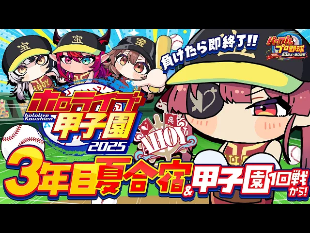 ホロライブ甲子園2025に向けた宝鐘マリンのパワプロ育成配信。裏で栄冠をやりこみ、オリ変3つ獲得!甲子園二回戦を突破するもフブキにスロースターターが…!?19日に3D重大告知あり!