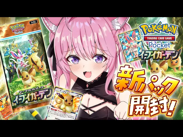 こよりがポケカ新パック「イーブイガーデン」を開封!キスで開封したりブースターを引きまくったり大騒ぎ。お目当てのニンフィアはなかなか出ず…?