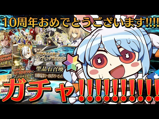 兎田ぺこらがFGO10周年記念ガチャに挑戦。狙いのドラコーやオルガマリーを引き当てる豪運を発揮し、特殊演出も多数出現。リスナーからは「さすが幸運の兎」と祝福コメントが多数寄せられた。ガチャ配信後、宝具演出を見る流れも好評だった。