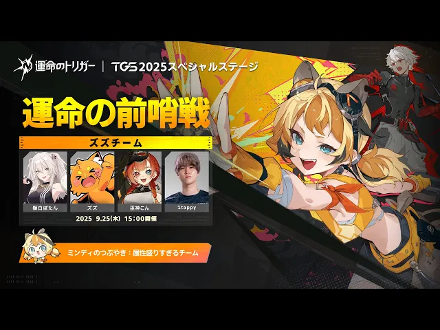 獅白ぼたん主催のゲーム『運命のトリガー』チーム戦配信。REJECTの新メンバーズズ、1tappy、巫神こんとチームを組み、TGS2025に向けた前哨戦に挑戦。チームVCでの作戦会議や試合後のインタビューなど、和気あいあいとした雰囲気でゲームを楽しむ様子が配信された。