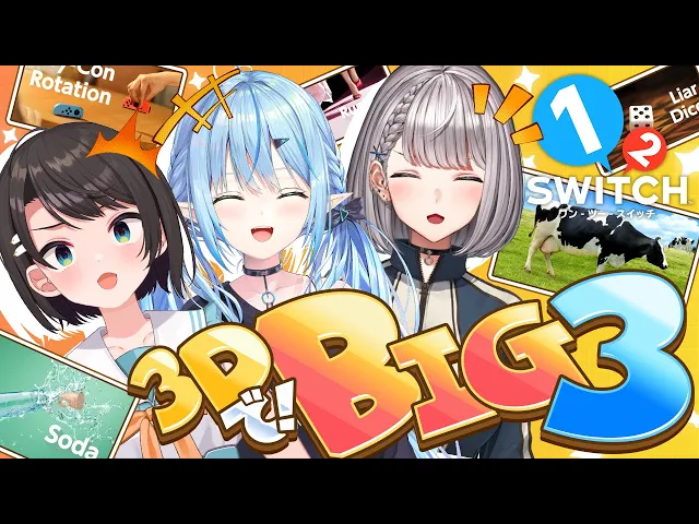 ホロライブBIG3(スバル、ノエル、ラミィ)が3Dで1-2-Switchコラボ!初期化されたSwitchでゲームが制限されるも、持ち前のフィジカルと面白さで盛り上がり、最終的には全ゲーム開放。3Dならではの動きや個性的なダンスで視聴者を楽しませた。
