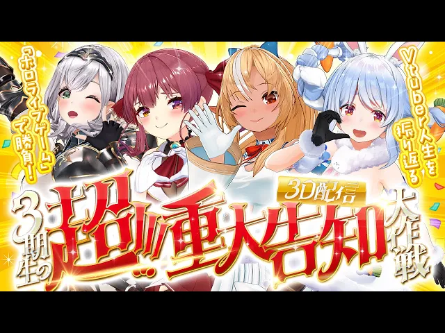 ホロライブ3期生が3D配信で重大告知!ホロライブゲームで盛り上がり、新曲発表、そして待望の2ndライブ開催決定!Kアリーナでの2DAYSにファン歓喜。グッズやEPリリースも発表され、3期生への愛が溢れる配信となった。