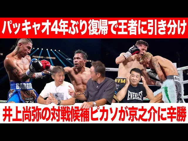 相次ぐリング禍への安全性の議論や、パッキャオ対ブラッドリー戦の真剣度、メイウェザーの金銭事情など、ボクシング界の裏話が炸裂。京之介の成長に期待する声や、バリオスの試合内容への疑問も噴出。レジェンド畑山の髪型にも注目が集まった。