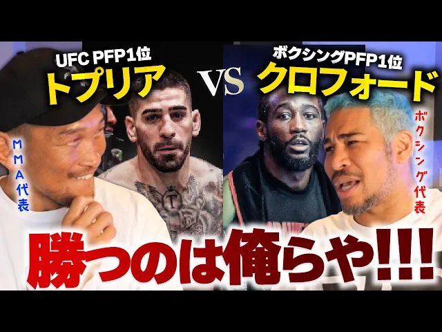 クロフォードとトプリアの試合に関する議論コメント集。バレンとジョビンの煽り合いが面白いという意見や、トプリアがボクシングでどこまで通用するか、マクレガーの二番煎じになることへの懸念などが語られている。MMAとボクシングの稼ぎ方の違い、選手のキャリア戦略についても議論。