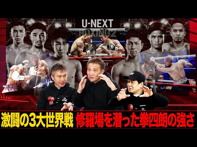 3大世界戦を観戦した感想戦。拳四朗の戦略、京口の善戦、岩田の課題、ユーリとオラスクアガの対戦希望など、試合内容への評価や今後の展望が語られる。畑山・竹原のスリッパ、気絶ネタ、笑点ネタも飛び出す緩さも。