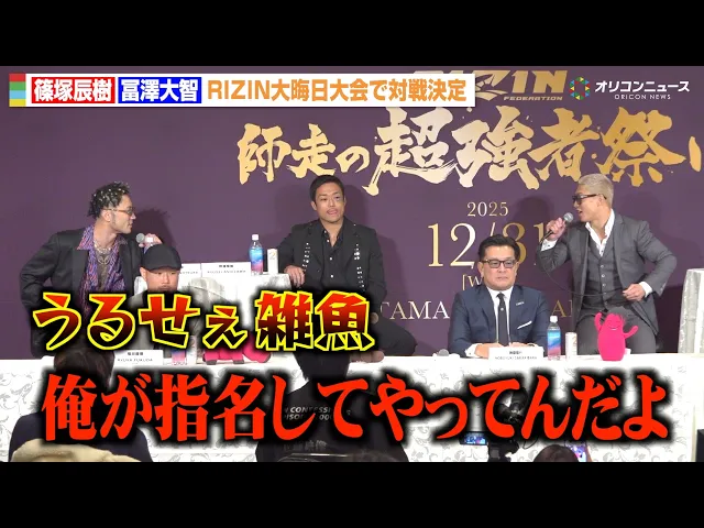 RIZINで再戦が決まった篠塚辰樹と冨澤大智が会見で激しいトラッシュトークを展開。冨澤の挑発に篠塚も応戦し、会場はヒートアップ。「イソギンチャク」「ちっちゃい安保」など、煽りワードが飛び交い、芦澤竜誠が仲裁に入る場面も。試合前から激しい火花を散らす両者の対決に期待が高まる。