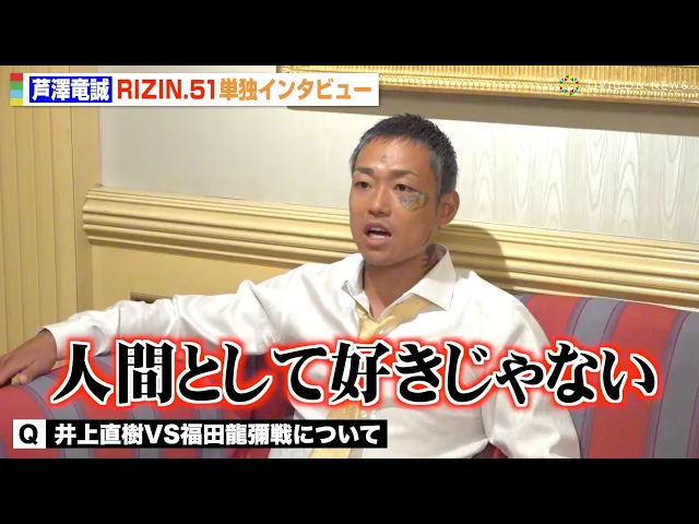 芦澤竜誠がRIZIN.51に向け、福田龍彌への静かな怒りを語るインタビュー動画。孤高の美学を貫き、スポンサーをつけない理由や、過去の試合への反省、今後の展望を語る。自信に満ちた発言と独特の哲学で、会場を盛り上げる。