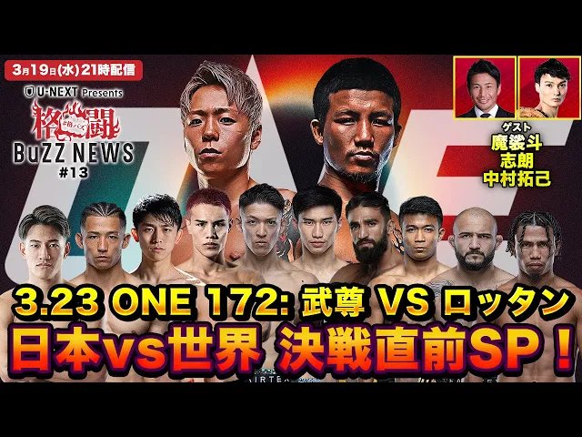U-NEXT独占配信「ONE 172: 武尊vsロッタン」直前SPへの期待と、魔裟斗×志朗の解説コンビに注目が集まる!野杁正明やタワンチャイへの応援、K-1とONEの現状分析など、格闘技ファン熱いコメントが飛び交う!世紀の一戦、見逃せない!
