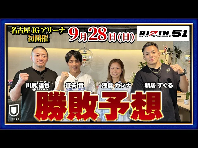RIZINとU-NEXTの勝敗予想番組。征矢、新居、浅倉カンナの3人が予想を展開。征矢の顔色や新居の様子から体調不良を指摘する声も。浅倉カンナの引退後の変化や、川尻達也の優しい人柄に好感を持つコメントも。