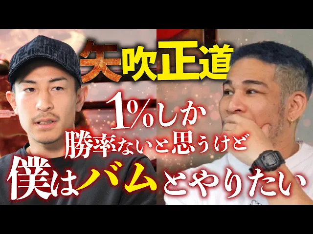 矢吹正道とバレンが対談。矢吹のボクシング観、家族愛、過去の試合やバッティング騒動について語られる。バム・ロドリゲスとの対戦希望や、意外な一面も垣間見える。